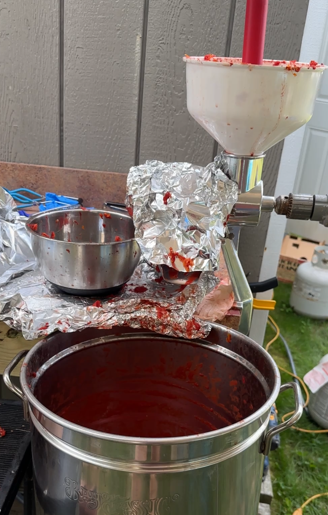 - Press through the tomato mill (hooking up the drill made it effortless).